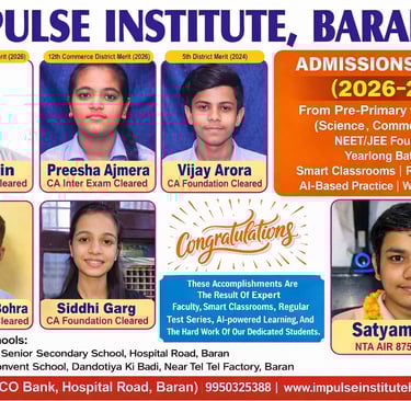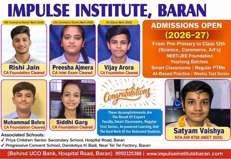 Impulse Institute, Baran proudly congratulates its brilliant students Rishi Jain, Vijay Arora, Mohammad Bohra, and Siddhi Garg for successfully clearing the CA Foundation Examination, and Preesha Ajmera for clearing the CA Intermediate Examination. All these students earlier demonstrated excellent academic performance in the Class 12th Commerce Board Examination, bringing district merit and outstanding results to the institute. Their achievements reflect strong conceptual understanding in commerce subjects, disciplined preparation, and unwavering dedication toward professional success. Clearing these prestigious CA examinations is a proud milestone not only for the students and their families but also for the entire Impulse Institute community. Their success story continues to inspire future commerce students to dream big and pursue careers in Chartered Accountancy with confidence and determination. ✨